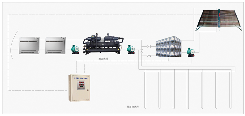 太陽能+水源熱泵中央供熱系統,太陽能為主,輔以水源熱泵機組為醫院提供清潔、高溫熱水,用于病房洗浴、醫療器械消毒及洗衣房用熱,同時可以解決冬季采暖及夏季制冷。