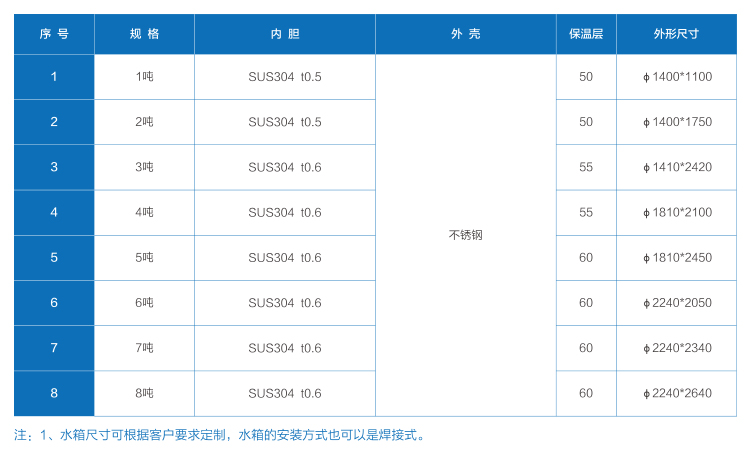 不銹鋼圓形保溫水箱 1、整板焊接,氬弧焊工藝,焊縫防腐性能強。 2、保溫采用整體發泡工藝,確保熱量低散失。 3、可根據用戶要求調整相關參數。